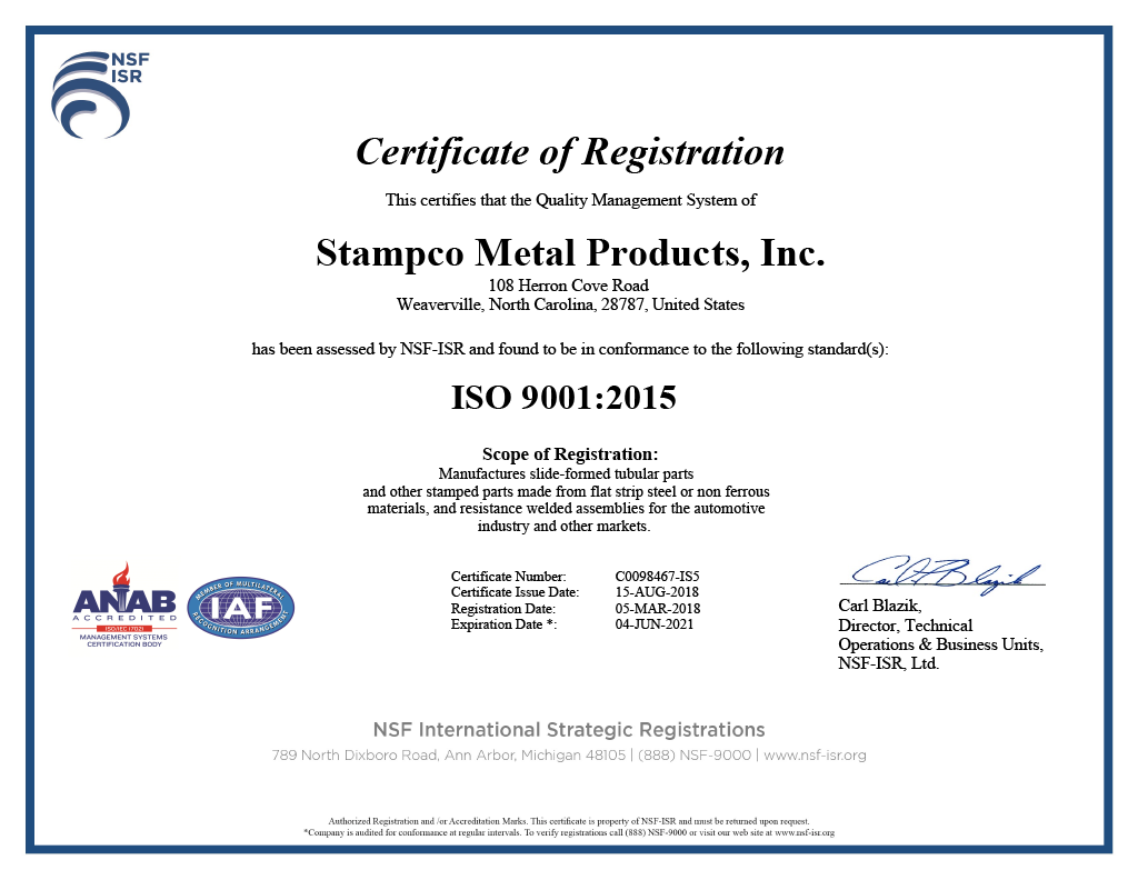 Stampco Metal Products, Inc. has been certified since 1998 to the ISO 9000 standard.
